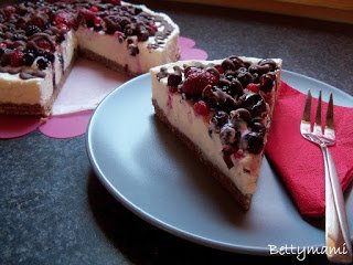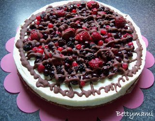A krém tetején elosztjuk az alaposan lecsöpögtetett gyümölcsöt, végül becsíkozzuk a felolvasztott csokival és hűtőben jól lehűtjük, mielőtt felszeleteljük.