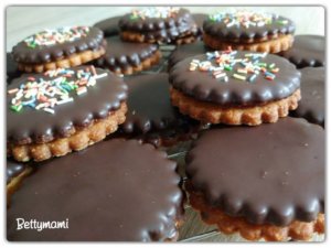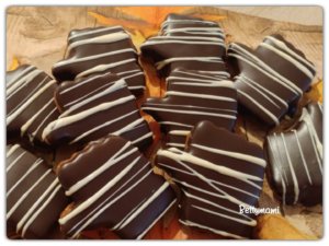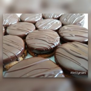 Másik, egyszerűbb módszer: a karikákat összeragasztjuk a lekvárral, és az alsó kekszet kézben tartva bemártjuk a felső karikát az olvasztott csokiba.