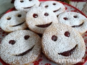 (az alsó kekszen van a csoki, egy kis színes cukorral díszítve a sarkait, közepén kis lekvár, rajta a porcukorral bőven megszórt lukas közepű másik keksz)