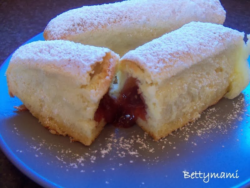 Lisztezett felületen vékony téglalap formára kinyújtjuk. Éles késsel kockára vágjuk tetszés szerinti nagyságúra (nagyobbakból 15-18db, kisebben akár 30db is kijön), majd egy kiskanál lekvárt rakunk minden négyzetbe. Föltekerjük, miközben a széleket kissé összenyomjuk.