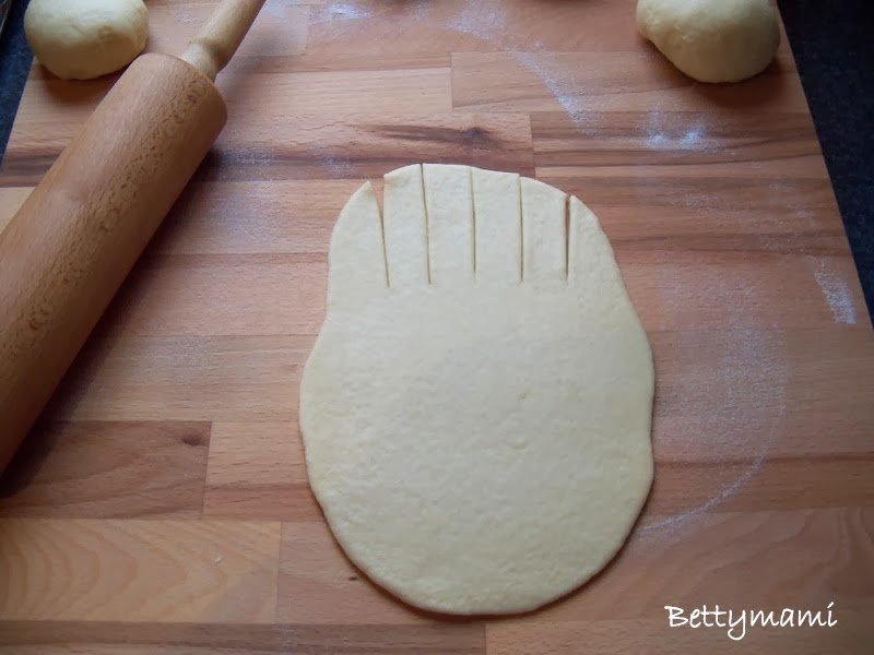 A gombócokat hosszúkásra kinyújtjuk és az egyik végén a tészta kb. 1/3 részéig 4-5db bevágást ejtünk.