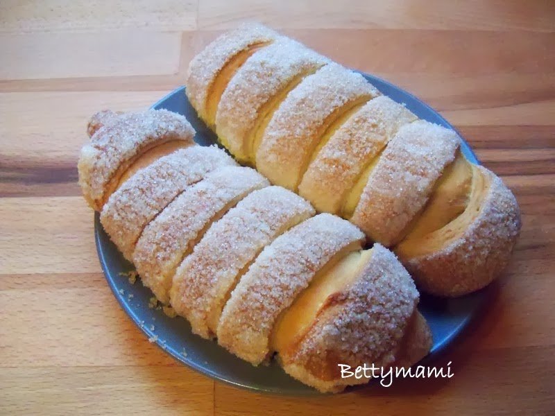 A megformázott kifliket megkenjük olvasztott vajjal és kristálycukorba(vagy akár ízesített cukorba) hempergetjük, majd sütőpapíros tepsire fektetjük.