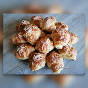 Az egyik lapot megkenjük az olvasztott vajjal, megszórjuk reszelt sajttal, majd ráillesztjük a másik kinyújtott tésztalapot. Nyújtófával kicsit lapítunk még rajta, majd egy éles késsel vagy pizzavágóval 16 cikkre vágjuk.