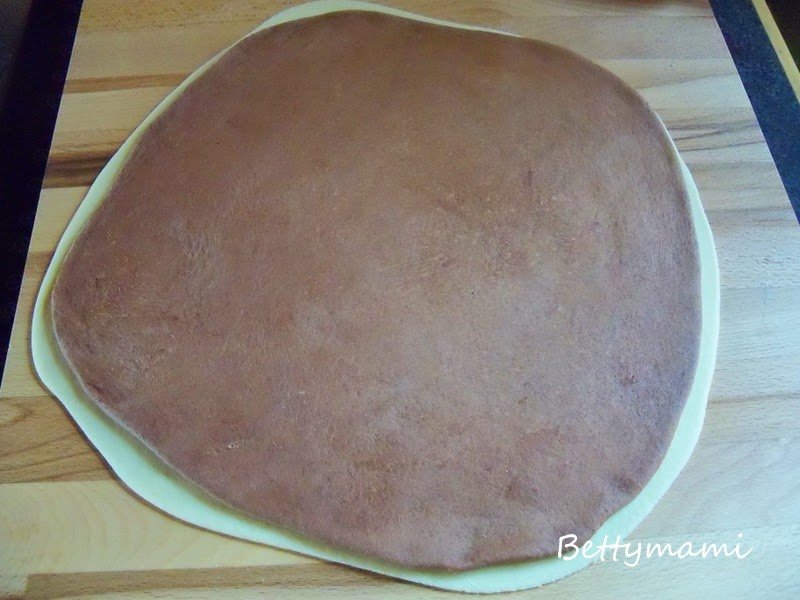 A világos tésztára ráillesztjük a barnát, így együtt egy picit még nyújtunk rajta.