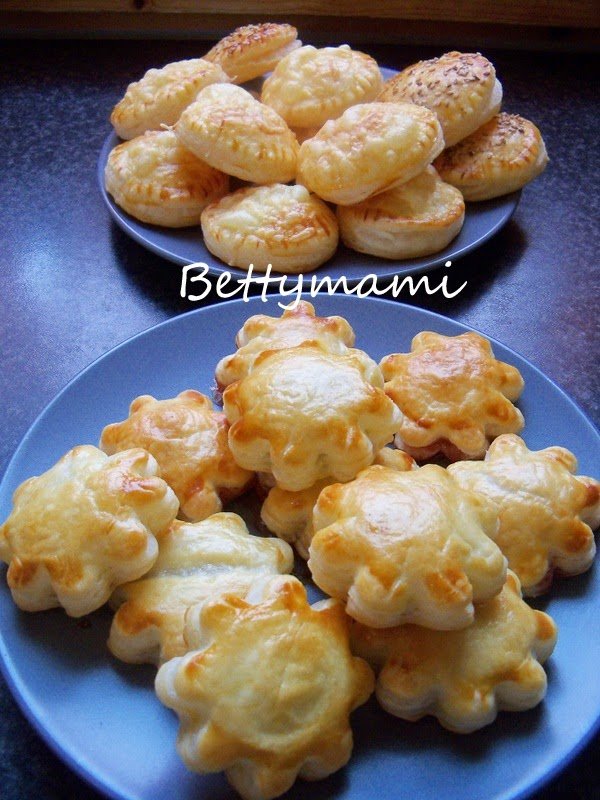 Az egyik csomag leveles tésztát tetszés szerinti formájú szaggatóval kiszaggatjuk. Közepére egy kis kanál tölteléket teszünk, majd a széleit körben lekenjük a kissé felvert tojással.