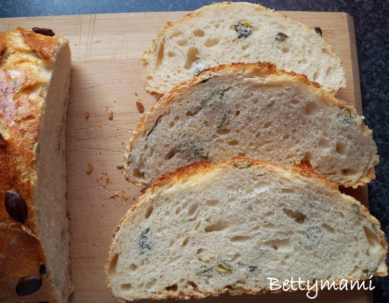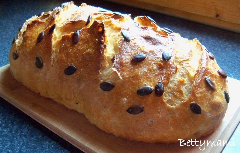 Ha már forró a sütő, a kenyér tetejét tetszés szerint bevágjuk, hideg vízzel jól lespricceljük, a jénai tetejét szintén, és ízlés szerint megszórhatjuk a kenyeret még egy kis tökmaggal, majd a jénai tetejét ismét rárakva kb. 50-55 perc alatt megsütjük.