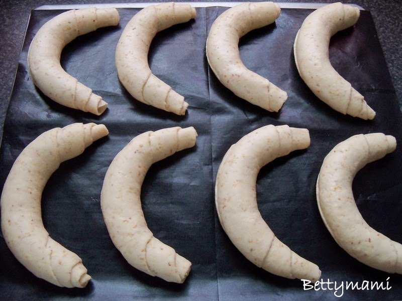 A kifliket kissé meghajlítva sütőpapírral bélelt tepsire fektetjük es ismét hagyjuk amíg majdnem duplára kelnek.