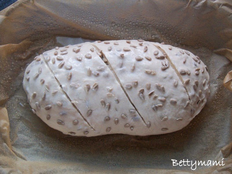 A hozzávalókat összedolgozzuk (én először 2,5dl vizet raktam bele, aztán, még 0,5dl-t odakészítettem és a tészta állagától függően adagoltam még hozzá, amíg egy közepesen kemény, jól gyúrható tészta lett), amikor már majdnem összeállt a tészta, akkor adjuk csak hozzá a napraforgómagot.