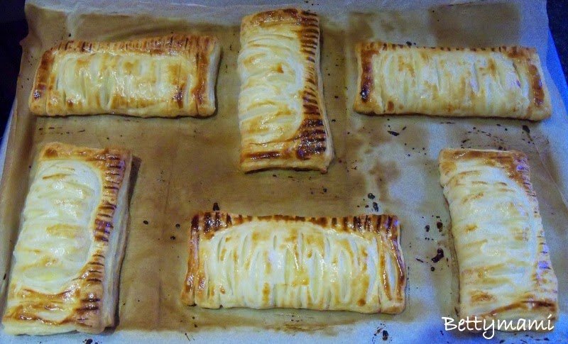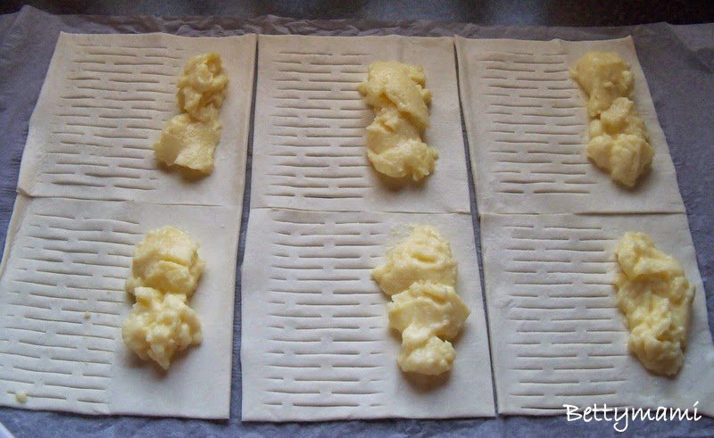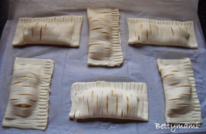 A tojást kettéválasztjuk és a fehérjével lekenjük a tészta szélét kb. 1 cm szélességben. Ráhajtjuk a rácsos oldalt, a széleket összenyomkodjuk, majd egy sütőpapírral bélelt tepsire fektetjük a megtöltött tésztákat: