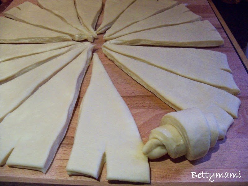 A körcikkek külső széleit középen kb. 1,5-2cm-re bevágjuk és a vágásokat kissé széthúzva befelé föltekerjük a tésztát.