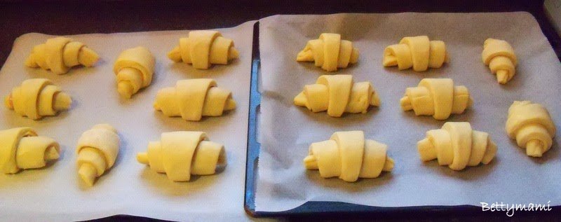 Majd egy sütőpapírral bélelt tepsire fektetjük a croissantokat és letakarva minimum 1 órát hagyjuk még pihenni, ill. amíg szemmel láthatóan is szépen megkelnek.