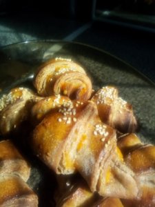 TIPP: Készíthetjük előre másnapra is, úgy hogy elkészítjük a tésztát, pihentetjük, megformázzuk, sütőpapíros tepsire fektetjük, letakarjuk folpackkal és hűtőbe rakjuk. Másnap sütés előtt lekenjük egy felvert tojással, majd a hideg sütőben kezdjük sütni.