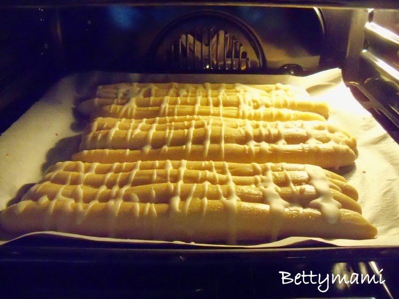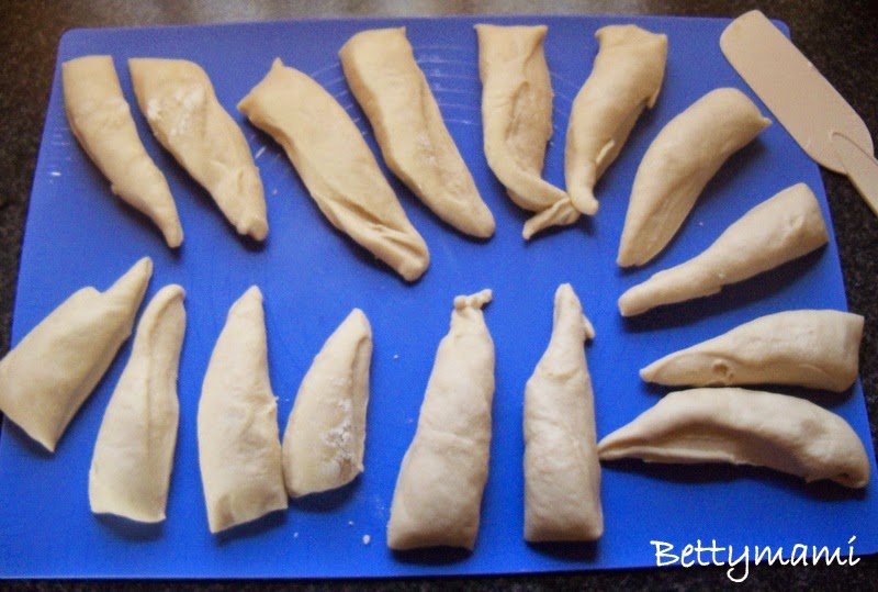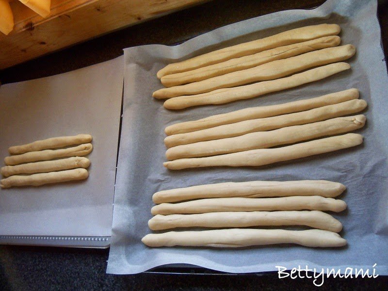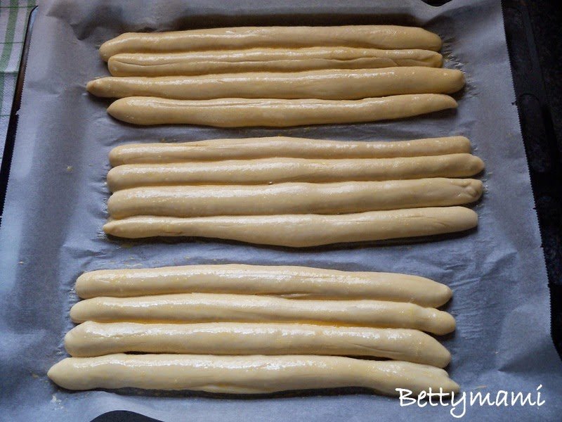 Minden darabot kicsit vastagabb, mint ujjnyira kisodorjuk és sütőpapírral bélelt tepsire fektetjük. Én négyesével tettem őket, de tetszés szerint variálhatjuk. Letakarva újra pihentetjük kb. 1 órát.