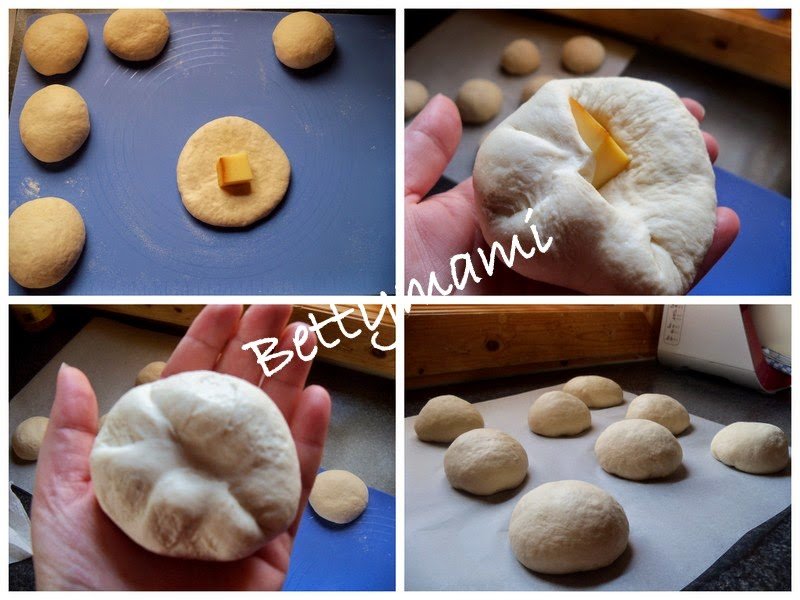 Majd tenyérrel kissé kilapítjuk és a közepébe teszünk egy kocka sajtot és körben a széléről behajtogatva gombócot formázunk és sütőpapírra rakjuk őket.