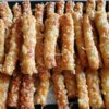Majd tenyérrel kissé kilapítjuk és a közepébe teszünk egy kocka sajtot és körben a széléről behajtogatva gombócot formázunk és sütőpapírra rakjuk őket.