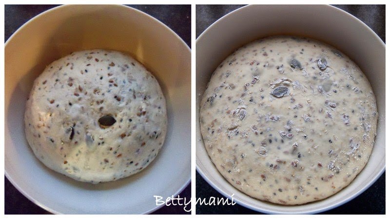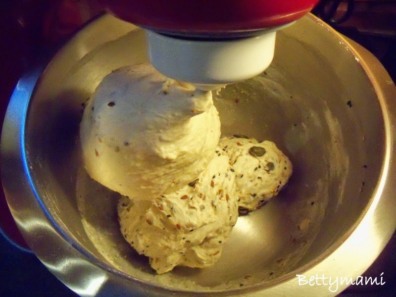 Végül hozzáadjuk a magokat is és néhány mozdulattal bedolgozzuk a tésztába.