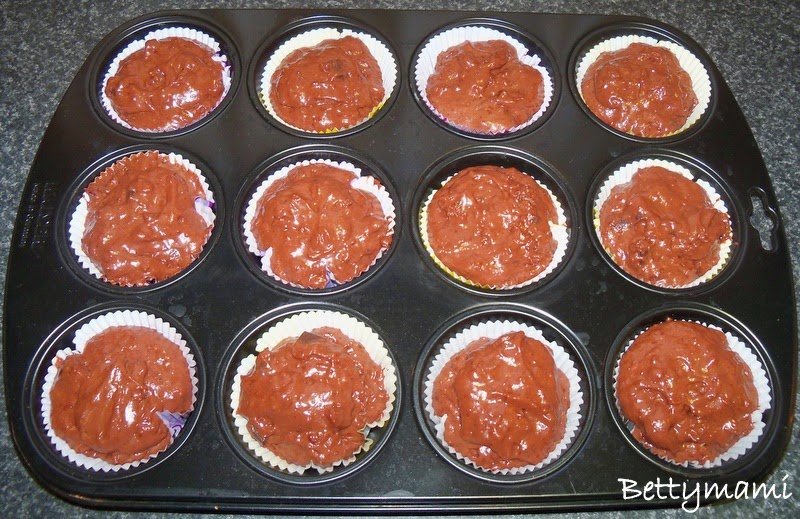 A muffin-formát kibéleljük papírral és kanállal elosztjuk benne a masszát.