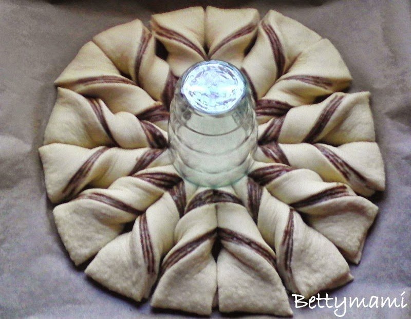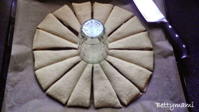 A tészta közepére helyezünk egy poharat és körben 16 cikkre bevágjuk, de csak ameddig a pohár van.