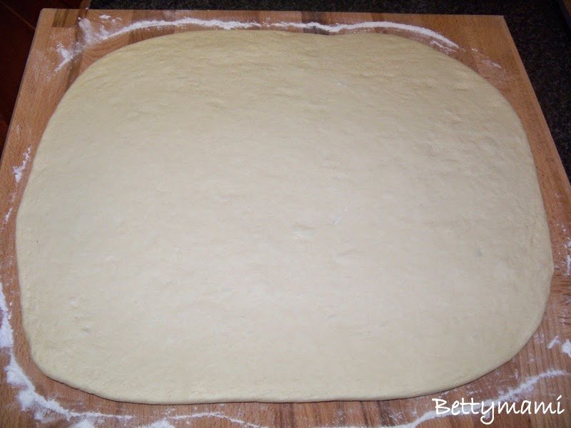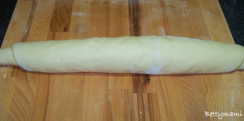 Enyhén lisztezett felületen kb.0,5cm vékonyra kinyújtjuk a tésztát.