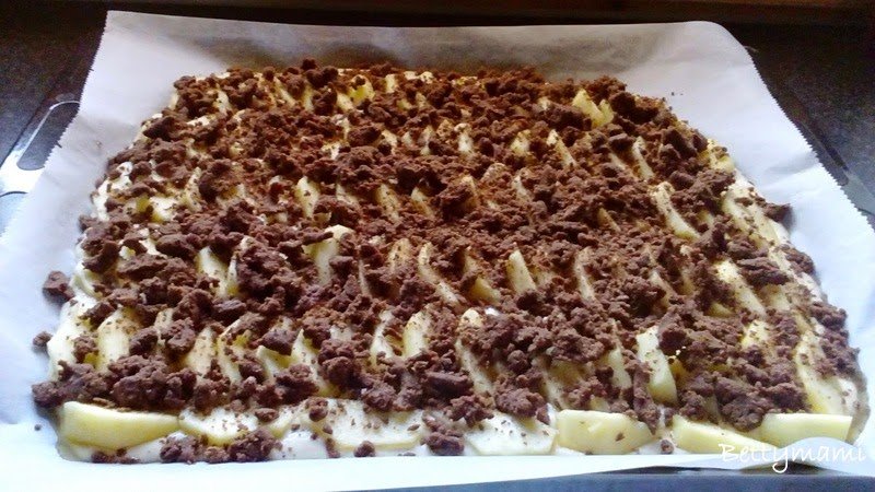 A kakaós morzsához a hozzávalókat kézzel összemorzsoljuk és a gyümölcs tetejére morzsoljuk.