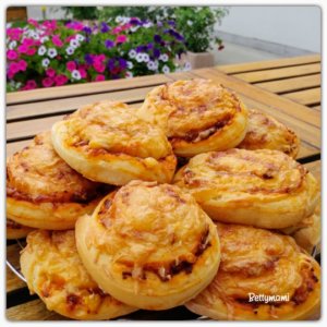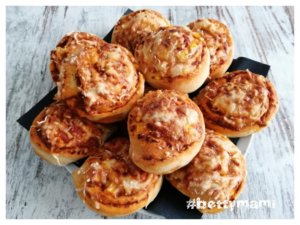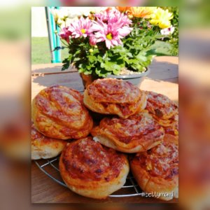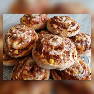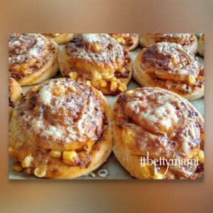Kb. 30 perc pihentetés után vékony, téglalap alakúra kinyújtjuk a tésztát. Rákenjük a húsos tölteléket, megszórjuk kukoricával, a karikára vágott kolbászt is elosztjuk rajta, végül meghintjük reszelt sajttal. Majd a szélesebb oldalánál feltekerjük és kb. 2 cm vastag szeletekre vágjuk. Mindjárt egy sütőpapíros tepsibe fektetjük, ahol ismét pihentetjük még kb. 30 percet, amíg bemelegszik a sütő.