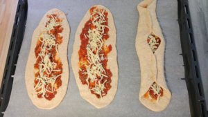 Minden kinyújtott darab közepére rakunk a töltelékből és két helyen összecsípjük a tésztát, hogy a két vége és a közepe nyitott maradjon.