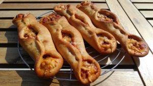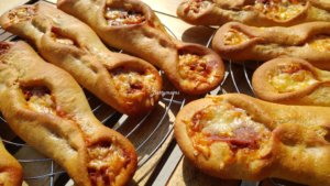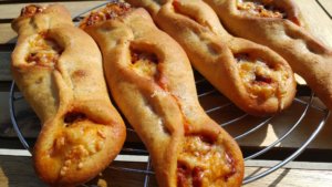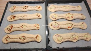 Enyhén lisztezett felületen 8 egyforma darabba vágjuk, és mindegyiket hosszúkás formára kinyújtjuk.