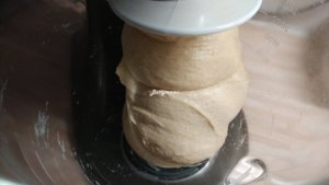 Majd belekeverjük a tejet, tojást, hozzáadjuk a lisztet, sót és elkezdjük dagasztani. Vége felé öntjük csak hozzá az olvasztott zsiradékot. Jól kidagasztjuk, lágyabb, puha, selymes állagú tésztát kapunk. Ha szükséges, korrigáljuk egy kis liszttel vagy tejjel.