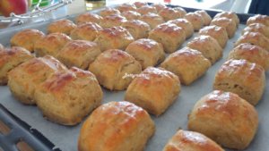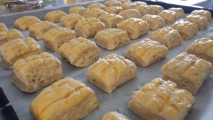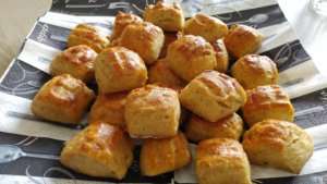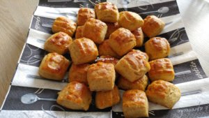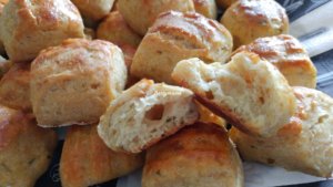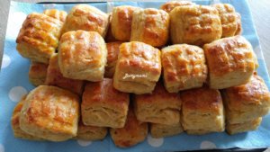 Kinyújtjuk kb. 1,5 cm vastagra, tetejét bekockázzuk és tetszés szerint kiszaggatjuk a pogácsákat, vagy egyszerűen csak kockákra vágjuk fel, sütőpapíros tepsire pakoljuk és ismét pihentetjük. Végül lekenjük a tetejüket egy kissé felvert tojással.