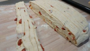 Ezt a hajtogatást összesen 3-szor elvégezzük kb. 30 perces időközönként, az utolsónál elosztjuk rajta az összevágott kolbászt.