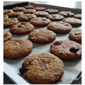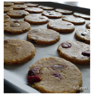 Először a száraz anyagokat keverjük össze, majd hozzáadjuk a puha vajat, a tojást és összedolgozzuk a tésztát. Legvégén adjuk csak hozzá a gyümölcsöt. Ha nagyon nem akar összeállni, egy icipici tejjel vagy tejföllel lazíthatjuk a tésztát. De vigyázzunk, tényleg nagyon kevés is elég! Cipóra gyúrjuk, formázzuk és fóliába csomagolva hűtőbe rakjuk kb. fél órára.