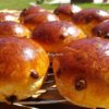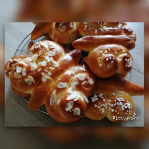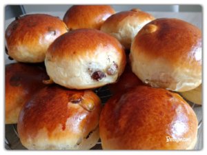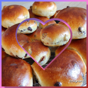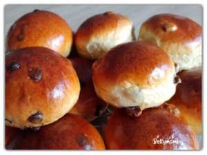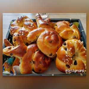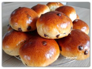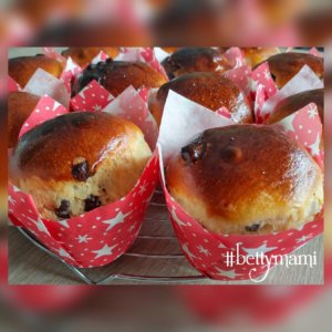 ~ A meglangyosított tejben elkeverjük a cukrot, hozzáadjuk az élesztőt és hagyjuk felfutni. Majd hozzákeverjük a tojások sárgáját, a vaníliát, aztán a lisztet, sót és elkezdjük dagasztani. A végefelé öntjük csak hozzá az olvasztott zsiradékot és puhább, közepesen lágyabb tésztát dagasztunk belőle. Ha szükséges, kis tejjel vagy liszttel korrigálhatjuk még. Legvégén adjuk csak hozzá a csokit vagy a mazsolát, amit néhány mozdulattal belekeverünk, csak annyira hogy nagyjából mindenhol el legyen osztva az egész tésztában.