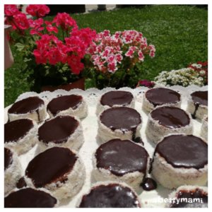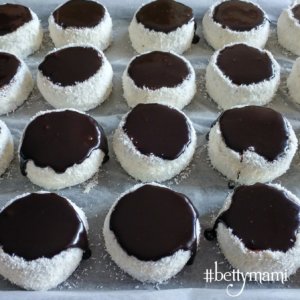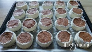 Kettesével összeragasztjuk a tejes krémmel és körben az oldalát is bekenjük, majd körbe belehempergetjük a kókuszreszelékbe.
