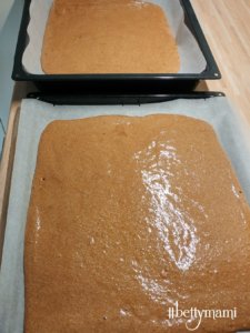 A masszát elfelezzük és sütőpapíros tepsin 2 lapot sütünk belőle. 180 fokra előmelegített sütőben kb. 15 perc alatt (tűpróba!)