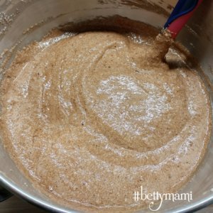 A száraz hozzávalókat egy tálban összekeverjük, majd a cukros masszához keverjük.