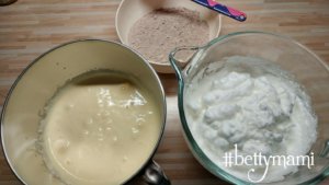 A tojássárgákat a cukorral kézimixerrel vagy robotgéppel kikeverjük/felverjük amíg szinte kifehérszik és a mennyisége/nagysága is megtöbbszöröződik a tálban.