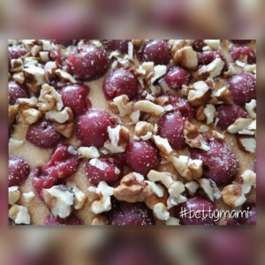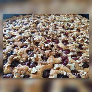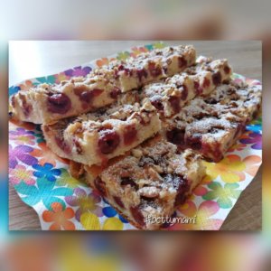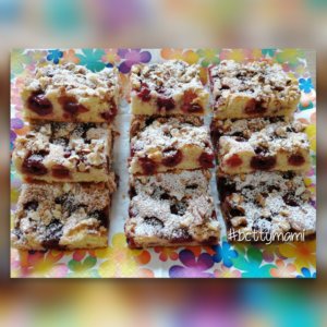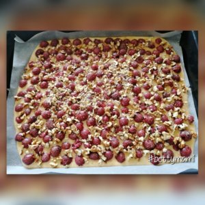 Tetején elosztjuk a lecsöpögtetett meggyet, megszórjuk a fahéjas cukorral, majd elosztjuk rajta a diót is.![]()