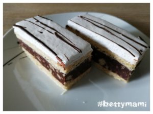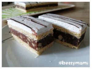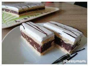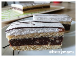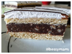A tojásfehérjét a porcukorral vízgőz felett kemény habbá verjük. Rákenjük a sütemény tetejére és tetszés szerint megszórhatjuk reszelt csokival, vagy kakaóport is szitálhatunk rá, vagy olvasztott csokival is becsíkozhatjuk a tetejét…stb. Majd legjobb egy éjszakát hűvös helyen pihenni hagyni, úgy kellemesen átpuhul a tészta. Egy jó éles, vékony pengéjű késsel szeleteljük.